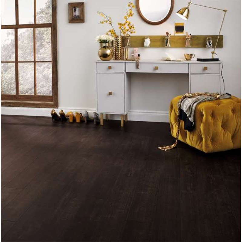 The Atra design in the Opus Wood range by Karndean Design Flooring is a rich dark brown with smokey hues and a subtle texture. The flat edge gives clean lines and a slick and stylish appearance that works well in a modern home.